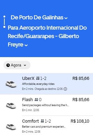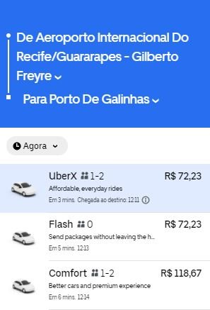 A Via Fly Viagens fez uma consulta no aplicativo Uber, e o valor da corrida estava estimado em cerca de R$ 72,23, sendo que o trajeto levaria cerca de uma hora. A espera no aeroporto era de três minutos.